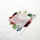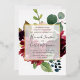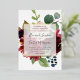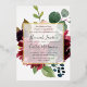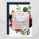 La elegante y moderna invitación a las bodas florales tiene un fondo de marsala borgoñona y flores rosas rubias, con capullos azul marino y eucalipto verde. Los detalles de su boda están colocados sobre un elemento blanco puro en elegantes letras inky off-black acentuadas con escritura a mano y un recorte de Relieve metalizado oro real.