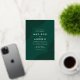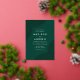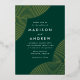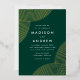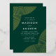 Invitaciones de boda modernas con Relieve metalizado dorado giran líneas geométricas en las esquinas con un fondo verde oscuro. Personalice las invitaciones a la boda de Relieve metalizado verde y dorado añadiendo sus nombres y detalles de boda. Las invitaciones bodas modernas del boho se revierten para mostrar un fondo verde oscuro.