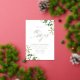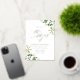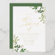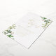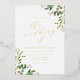 Elegante invitación a bodas botánicas con detalles bodas mostrados en letras de Relieve metalizado dorado con follaje acuático pintado en vibrantes tonos de primavera y verde musgo en las esquinas y un moderno tipo de letra caligrafía. Las elegantes invitaciones botánicas de boda son perfectas para bodas de primavera y verano.