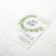 Crea invitaciones de boda elegantes que incluyen corona de eucalipto de color agua y texto negro y dorado sobre fondo blanco. El texto de la plantilla facilita la personalización. El follaje botánico decora la parte delantera y trasera de las invitaciones a la boda.