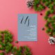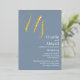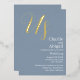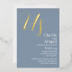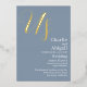 Esta elegante invitación de boda moderna presenta un fondo azul polvoriento. El título "Nosotros" está impreso en una fuente grande de lámina dorada en la parte superior, encima de los nombres de la pareja que se casa. La información de la boda se imprime debajo en una fuente negra sofisticada.