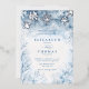 Esta invitación a la boda de Winter Falling Forest encarna la elegancia rústica con su encantador diseño de acuarela y los verdaderos acentos de Relieve metalizado plateado para los copos de nieve y la caída de elementos de nieve. La escena presenta una nieve blanca y delicada que cae suavemente sobre un bosque sereno, con elementos de escarcha y tonos suaves y mezclados de azul y blanco que capturan la tranquilidad de un bosque de invierno. Perfecto para parejas que aman el arte, los diseños únicos y la sofisticación moderna, esta invitación es una elección ideal para bodas de invierno en noviembre, diciembre, enero o febrero.