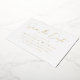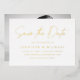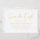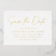 Simplemente guarde la tarjeta de fecha con "Save the Date" en un guión de Relieve metalizado dorado escrito a mano con fondo blanco. Personalice el moderno guardar la tarjeta de fecha agregando sus nombres, fecha de boda, ubicación de boda, sitio web de boda, etc. El minimalista guarda la tarjeta de fecha se revierte para mostrar tu foto de compromiso horizontal favorita.
