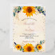 Fondo de color blanco y dorado, decorado con girasoles, vegetación eucaliptos, hojas doradas y polvo falso purpurina de oro. Personalice y agregue sus nombres y detalles del fiesta. Texto de oro negro y rosa. El oro rosa está escrito con verdadero Relieve metalizado.