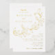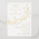 Invitaciones botánicas de boda con sus nombres y detalles bodas en letras de Relieve metalizado dorado divididas por una vid de hojas esbozadas con fondo blanco. Las elegantes invitaciones a bodas de Relieve metalizado dorado se coordinan con nuestra colección de bodas de las hojas de cascadas.