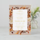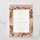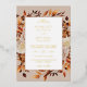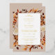 Esta elegante y moderna invitación a la boda incluye un hermoso marco de hojas de naranja y terracota de color boho quemadas a mano, dahlias crema y beige y hermosos rosas de color rojizo sobre un fondo de taupe impreso en Relieve metalizado de oro real. Buscar elementos coincidentes en la colección Taupe Autumn Romance.