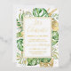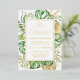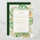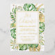 Esta elegante invitación de celebración de boda de fuga tropical presenta hojas de palma, filodendro y helecho en verde y dorado. Un elegante marco de lámina dorada resalta el texto en lámina dorada. Salpicaduras de lámina dorada acentúan este diseño botánico exótico y aportan un toque de fantasía moderna a la invitación. "¡Celebremos!" junto con los nombres de los recién casados aparecen en la parte superior. Los detalles del voto matrimonial y la recepción están debajo. La información de RSVP está en el reverso de la invitación.
