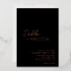 Invitación a una boda moderna en Relieve metalizado negro y rosa de oro con un diseño sencillo y mínimo, con el nombre de la novia en un guión elegante y el nombre del novio en una fuente contemporánea sans serif. Debajo, en la esquina inferior derecha, están los detalles de los eventos en un diseño minimalista. Todo el texto en la parte delantera está impreso en Relieve metalizado real.
