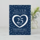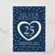 Bodas de plata aniversario de 25 años fiesta azul oscuro y papel de aluminio plateado en la parte delantera. Aniversario de bodas de plata número veinticinco fiesta evento con dos fotos en el reverso. Personalice con los detalles de su fiesta de aniversario de bodas y dos fotos en los corazones de plata, una ahora y otra de su boda hace 25 años. Otros artículos relacionados están disponibles. Arte y diseño por www.mylittleeden.com en Zazzle.