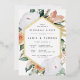 La elegante invitación a la cena de los ensayos florales se caracteriza por un alargado marco hexagonal de flores acuáticas y follaje en tonos boho desérticos de melocotón, blanco, marfil y verde sabio, y acabado con guarnecido dorado de Relieve metalizado. Personaliza con tu boda el ensayo de ceremonia y los detalles de la cena con letras modernas.