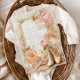Un diseño rústico de moda de ducha de bebé con botas de vaquera acentuadas con peonías rosadas de color, vegetación suave y detalles de oro brillantes. Perfecto para una celebración de temática occidental con un toque floral femenino.