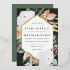 Elegante invitación a la boda floral con detalles bodas en letras modernas, enmarcada en un marco geométrico alargado en forma de hexágono de flores de color pastel de acuarela y follaje botánico en tonos tierra inspirados en el desierto de melocotón, verde salvia, blanco y marfil. El recorte de Relieve metalizado dorado completa el aspecto de lujo.