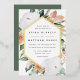 Elegante invitación a la boda floral con detalles bodas en letras modernas, enmarcada en un marco geométrico alargado en forma de hexágono de flores de color pastel de acuarela y follaje botánico en tonos tierra inspirados en el desierto de melocotón, verde salvia, blanco y marfil. El recorte de Relieve metalizado dorado completa el aspecto de lujo.