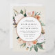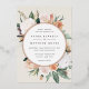 Elegante invitación a la boda floral con detalles bodas en letras modernas, enmarcada en un marco redondo de flores de color pastel y follaje botánico en tonos tierra inspirados en el desierto, de melocotón, verde salvia, blanco y marfil. El guarnecido Rosa de Relieve metalizado dorado completa el estilo de un toque de lujo.