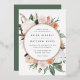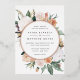 Elegante invitación a la boda floral con detalles bodas en letras modernas, enmarcada en un marco redondo de flores de color pastel y follaje botánico en tonos tierra inspirados en el desierto, de melocotón, verde salvia, blanco y marfil. El guarnecido Rosa de Relieve metalizado dorado completa el estilo de un toque de lujo.