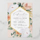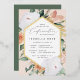 La elegante invitación a la confirmación floral incluye un alargado marco hexagonal de flores acuarelas y follaje en tonos boho desérticos de melocotón, blanco, marfil y verde salado, y acabado con un adorno de Relieve metalizado dorado. Personalice con su ceremonia de la iglesia y los detalles del fiesta de confirmación con letras modernas.