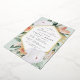 Elegante invitación floral a la devoción por el bebé, presenta un alargado marco hexagonal de flores acuáticas y follaje en tonos boho desérticos de melocotón, blanco, marfil y verde salado, y acabado con guarnecido dorado de Relieve metalizado. Personaliza con tu ceremonia de entrega de la iglesia y detalles fiestas con letras modernas.