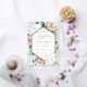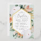 La elegante invitación al bautismo floral presenta un marco hexagonal alargado de flores acuarelas y follaje en tonos boho desérticos de melocotón, blanco, marfil y verde sabio, y acabado con guarnecido dorado de Relieve metalizado. Personaliza con tu ceremonia de bautismo de iglesia y detalles fiestas con letras modernas.