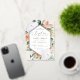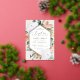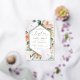 La elegante invitación al bautismo floral presenta un marco hexagonal alargado de flores acuarelas y follaje en tonos boho desérticos de melocotón, blanco, marfil y verde sabio, y acabado con guarnecido dorado de Relieve metalizado. Personaliza con tu ceremonia de bautismo de iglesia y detalles fiestas con letras modernas.