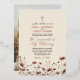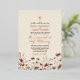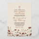 Invite a sus amigos y familiares a compartir su alegría mientras celebra a su boda con esta hermosa invitación al Relieve metalizado. El diseño rústico de la moda boho presenta un borde de delicadas flores silvestres en tonos tierra de arcilla de terracota y un rosa polvoriento sobre un fondo de color crema o taupe neutro. Diseñado para una ceremonia católica, hay una cruz o crucifijo en la parte superior y el texto invita a sus invitados a unirse a usted para una masa nupcial que los une en el sacramento del santo matrimonio. La cruz, los nombres y el texto resaltado se imprimen en Relieve metalizado de oro rosa presionado, haciendo esta invitación mucho más elegante. La parte posterior tiene espacio para la foto, o si lo prefiere puede usar la herramienta de diseño para borrar la foto que revelará un ramo de las mismas flores silvestres sobre un fondo de color mocha o terrón color tostado.