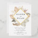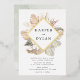 Invitaciones a bodas tropicales modernas con nombres dentro de un marco de Relieve metalizado dorado en forma de diamante con fondo blanco. Flores tropicales y follaje rodean el marco en tonos tierra de crema, marrón, beige, óxido, verde marrón y salvia. Las invitaciones a bodas de boho tropicales se revertirán a un fondo de color verde claro y sabio.