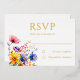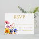Este encantador RSVP de bodas de flores silvestres cuenta con magníficas letras de Relieve metalizado dorado, lo que contrasta de manera elegante y sofisticada con las flores silvestres de temática boho más sencillas que se encuentran en la esquina inferior. En la parte trasera también hay el mismo ramo de flores silvestres. Los huéspedes bodas apreciarán la sencillez y elegancia de la invitación RSVP de nuestro Relieve metalizado "Boho Wildflower Garden Wedding".