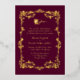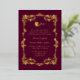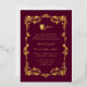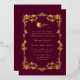 Invitación a la boda de Relieve metalizado de oro ordenado en un rosa de orquídea oscura con rosas de oro enmarcando el área de texto y un único rosa de tallo largo en la parte superior del área de texto. Personalice el texto del Relieve metalizado para adaptarlo a sus necesidades bodas.