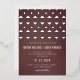 Esta invitación a la boda presenta un verdadero patrón de estilo azteca de Relieve metalizado levantado con tipografía fácil de personalizar en un diseño simple y limpio, todo con un fondo sutilmente texturado de rojo burdeos profundo. Personalice esta invitación cambiando el color de fondo para que se adapte a sus necesidades y cree una invitación de evento única con el toque de Southwestern Boho.
