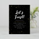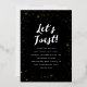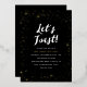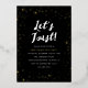 Fije el tono para su celebración con estas invitaciones modernas a la fiesta de Nochevieja, que incluyen la frase "¡Tostemos!" en una elegante letra de escritura blanca. Un brillante borde de estrellas de Relieve metalizado dorado sobre un elegante fondo negro añade un toque de elegancia y festividad. Personalice estas invitaciones de Relieve metalizado de oro de Nochevieja con los detalles de su fiesta para crear una manera impresionante y personalizada de invitar a los invitados a su celebración de fin de año. Perfecto para organizar una moda y memorable reunión de Nochevieja.