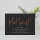 ¿Necesitas cambiar la fecha de tu boda? Notifica a tus invitados con esta tarjeta moderna y desenfadada que incluye "giro inesperado" en letra manuscrita con lámina de oro rosa sobre un fondo negro suave y rico. Personaliza con tus nombres y la nueva fecha de la boda debajo en letra blanca.