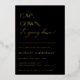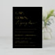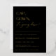 CAP, GOWN, ¡se va abajo! Relieve metalizado dorado Invitación a la fiesta de graduación contemporánea. Diseño de tipografía moderna sobre telones de color negro clásicos con un falso respaldo de patrón geométrico oro.