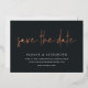 Una tarjeta de fecha moderna para guardar la tarjeta diseñada para parejas de lujo o bodas de la ciudad. "Salven la fecha" aparece en la letra manuscrita casual del Relieve metalizado de oro rosa real. Personalice con sus nombres, fecha de boda y ubicación boda debajo de las letras blancas en un suave fondo negro.