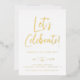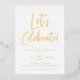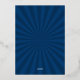 Guión moderno ¡Celebremos!, invitación a la fiesta de cumpleaños del Relieve metalizado. La parte posterior de la tarjeta presenta un fresco patrón de ráfagas de sol retro en azul.