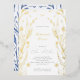 Ensayar la invitación al Relieve metalizado de la cena con un marco de ramas elegantes con mariposas y hojas azules. Flores delicadas azules dibujadas a mano sobre fondo blanco. Fondo romántico de naturaleza floral. Resumen de las ramas naturales. Diseño floral de primavera o verano. Parcela botánica. Botánica azul suave Ensayos Invitación al Relieve metalizado de la cena. Colección Blue Buttercup.