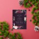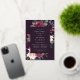 La invitación a la cena de moda con un ensayo floral incluye un borde de morada de marsala, flores azules rosas y ruidosas, un frondoso follaje botánico, vegetación y adornos de Relieve metalizado dorado. Personaliza con tu boda el ensayo de la ceremonia y los detalles de la cena con letras modernas en un rico fondo morado oscuro.