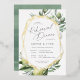 Las invitaciones para la cena de primavera o verano, con un tema de naturaleza hermosa, incluyen letras grises enmarcadas por un borde geométrico de Relieve metalizado dorado y delicados ilustraciones acuáticos de vegetación mediterránea, hojas, aceitunas y limones. Una selección moderna en un esquema de colores naturales para las cenas de bodas con temática bohana o natural.
