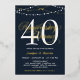 Invitación a la cena del 40 aniversario del boda en azul marino con detalles de Relieve metalizado blanco y dorado. Invitación a la cena de aniversario sin foto con los años en que te has casado con una fuente blanca y tus nombres con Relieve metalizado dorado. Elegante 40º aniversario boda invitación a cenar personalizada con sus nombres en Relieve metalizado dorado con un fondo azul marino.
