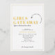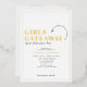 Disfruta de un impresionante fin de semana de soltera bebiendo vino rosado todo el día en tu destino favorito de escapada con esta moderna y moderna invitación con un audaz encabezado en un verdadero Relieve metalizado de oro que dice "Chicas Getaway", el diseño se termina al revés con un contraste de antecedentes de carbón vegetal con el itinerario de eventos de fin de semana. Personalice la información con los campos de plantilla proporcionados.