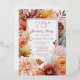 Elegante crisantemo y peonías florales de diseño "70th Birthday Party" con un marco floral de mamáes y flores de peonía en burdeos, naranja quemado, albaricoque y rosa sobre un panel de fondo blanco central. Hermoso texto de Relieve metalizado real de oro rosa. El diseño posterior presenta un fondo de acuarela de colores coordinados de varias capas
