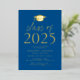 Invite a los huéspedes a celebrar el grado con nuestra moderna clase de 2023 invitados a la fiesta de graduación. Las invitaciones presentan un tapón de graduación en la parte superior con la "Clase de 2023" mostrada en letras de Relieve metalizado dorado con un fondo azul. Personalice las invitaciones agregando el nombre del graduado, la escuela y los detalles de la fiesta de graduación. La fiesta de graduación del Relieve metalizado de oro invita a revertir para mostrar la foto del graduado.
