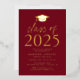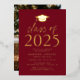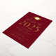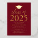 Invite a los huéspedes a celebrar el grado con nuestra moderna clase de invitados a la fiesta de graduación 2025. Las invitaciones presentan un tapón de graduación en la parte superior con la "Clase de 2025" mostrada en letras de Relieve metalizado dorado con fondo burdeos. Personalice las invitaciones agregando el nombre del graduado, la escuela y los detalles de la fiesta de graduación. La fiesta de graduación del Relieve metalizado de oro invita a revertir para mostrar la foto del graduado.