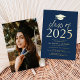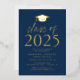 Invite a los huéspedes a celebrar el grado con nuestra moderna clase de invitados a la fiesta de graduación 2025. Las invitaciones presentan un tapón de graduación en la parte superior con la "Clase de 2025" mostrada en letras de Relieve metalizado dorado con un fondo azul marino. Personalice las invitaciones agregando el nombre del graduado, la escuela y los detalles de la fiesta de graduación. La fiesta de graduación del Relieve metalizado de oro invita a revertir para mostrar la foto del graduado.