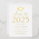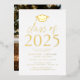 Invite a los huéspedes a celebrar el grado con nuestra moderna clase de invitados a la fiesta de graduación 2025. Las invitaciones presentan un tapón de graduación en la parte superior con la "Clase de 2025" mostrada en letras de Relieve metalizado dorado. Personalice las invitaciones agregando el nombre del graduado, la escuela y los detalles de la fiesta de graduación. La fiesta de graduación del Relieve metalizado de oro invita a revertir para mostrar la foto del graduado.