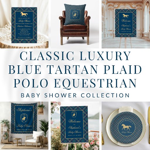 Classic Preppy Plaid Blue Equestrian Baby Shower Invitation with Real Gold Foil Accents - A preppy, classic and luxury baby shower invitation with equestrian and plaid elements in navy, hunter green with gold tone and burgundy red accents. A running horse silhouette adorns the top and the tartan pattern adds a timeless touch. Perfect for an Old Money themed baby shower with a classic, vintage and luxurious feel. If you like grandpa core, vintage style this is a great baby shower invite. Available in print and as a digital download. Customize this editable baby shower invitation template with your own event details.
