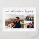 Un diseño moderno y emocionante para guardar la tarjeta de fecha para la pareja de mente aventurera, este diseño limpio y simple presenta tres fotos horizontales o orientadas al paisaje en un diseño de collage de cuadrícula, con "nuestra aventura comienza" arriba en el guión con letras de mano de Relieve metalizado plateado. Personalice con su invitación, nombres y detalles adicionales a lo largo de la parte inferior y agregue más (como su sitio web boda) a la parte posterior.