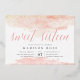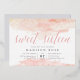 Moda dulce dieciséis invitaciones en color rosa y gris oscuro presentan lavados de color rosa rubor en la parte superior e inferior con confeti de Relieve metalizado dorado y "dulce dieciséis" con letras caligráficas de color agua rosa. Personaliza con tus dulces detalles de tu fiesta de 16 cumpleaños bajo un elegante gris.