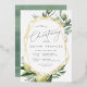 Las invitaciones para el bautizo de primavera o verano, con un tema de naturaleza hermosa, incluyen letras grises enmarcadas por un borde geométrico de Relieve metalizado dorado y delicados ilustraciones de acuarela de vegetación mediterránea, hojas, aceitunas y limones. Personaliza con tu ceremonia de la iglesia y detalles de la celebración. Una selección moderna en un esquema de color natural para eventos de tipo boho o naturaleza.