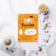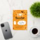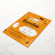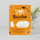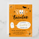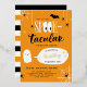 Invitación de cumpleaños de Halloween con Spooktacular escrito en una combinación de fuentes divertidas, las dobles oo en spook diseñadas para parecer ojos grandes. El texto está rodeado de estrellas doradas, arañas y un murciélago. Y un fantasma adorable dice a sus invitados el nombre y la edad del niño. La parte trasera cuenta con rayas a juego en negro, blanco y naranja.