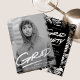 Invitación moderna a una fiesta de graduación con la foto vertical del graduado con "Grad" en letras escritas a mano en Relieve metalizado de plata con un guion abajo. Personalice la invitación de la fiesta de graduación de fotos de moda agregando el nombre del graduado y el nombre de la escuela. La invitación de la fiesta de graduación de Relieve metalizado plateado se invierte para mostrar los detalles de su fiesta con un fondo de pincelada de color negro y blanco.