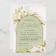 Las invitaciones a la moda tropical para bebés en una atractiva paleta de color neutro cuentan con un arco de Relieve metalizado oro rosa que lleva su ceremonia de la iglesia y celebración o detalles fiestas, acentuados con frondas de palma de color verde pálido, follaje de la isla de la playa, orquídeas blancas, botánicos secos boho y pasto de pampas.